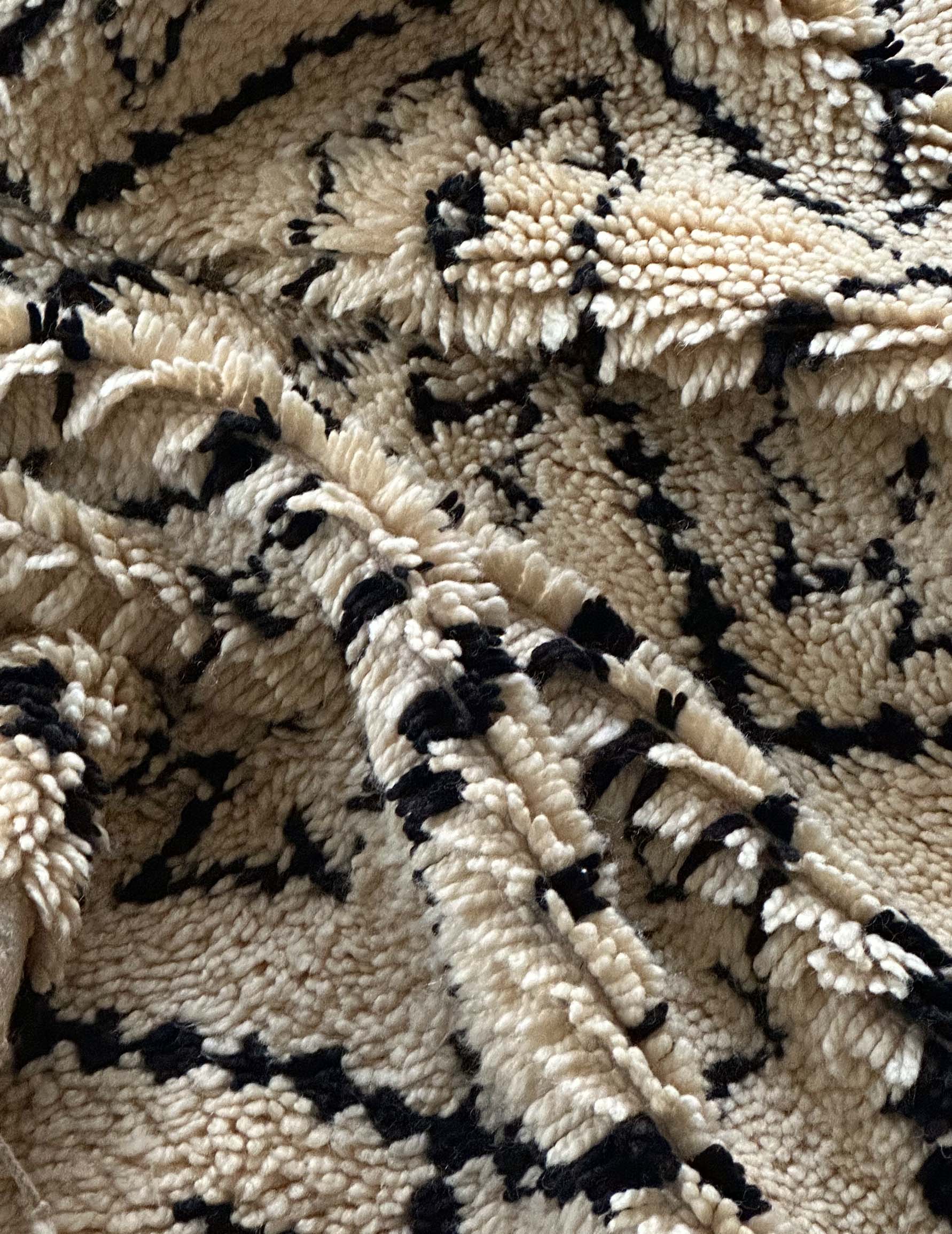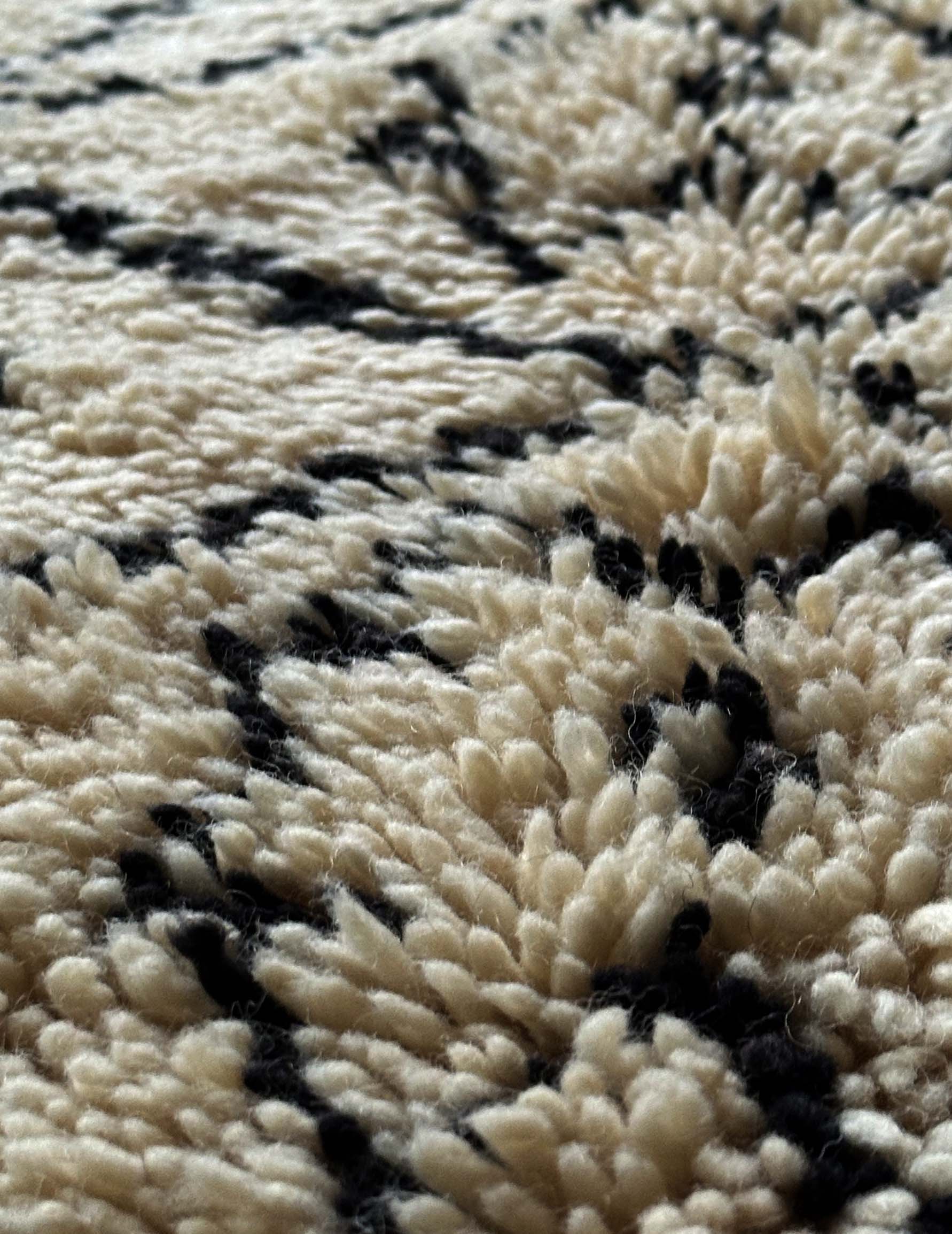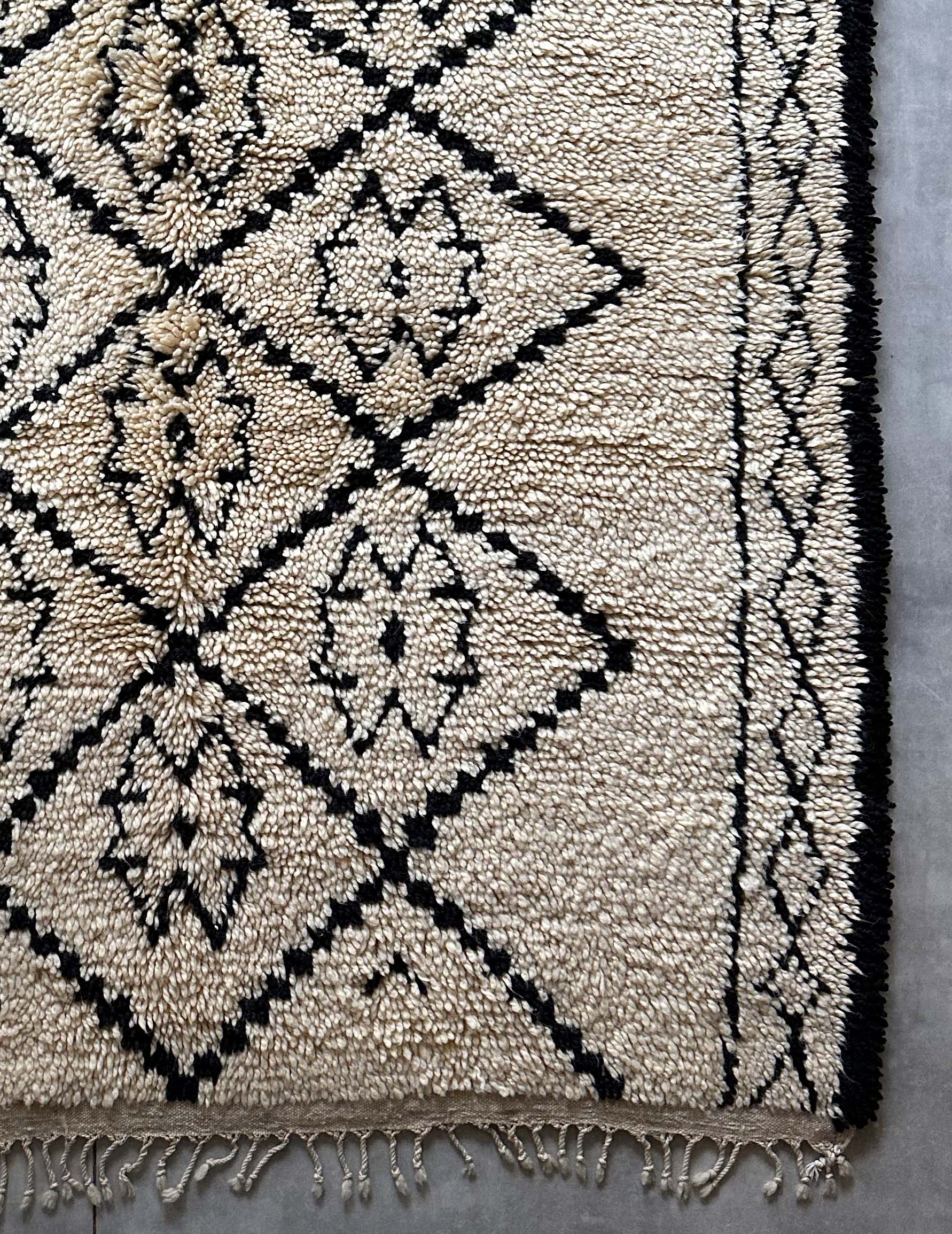 ベニワレンはモロッコのアトラス山脈に住むベルベル人女性によって、一目一目しっかりと結びながら織らているハンドメイドのウールラグです。白を基調とし黒の細いラインで模様が描かれています。触り心地はふわふわと柔らかく長い毛足が特徴です。白を基調としたシンプルなデザインとナチュラルな色合いは、コーディネートの幅も広く他のインテリアとも調和しやすいです。