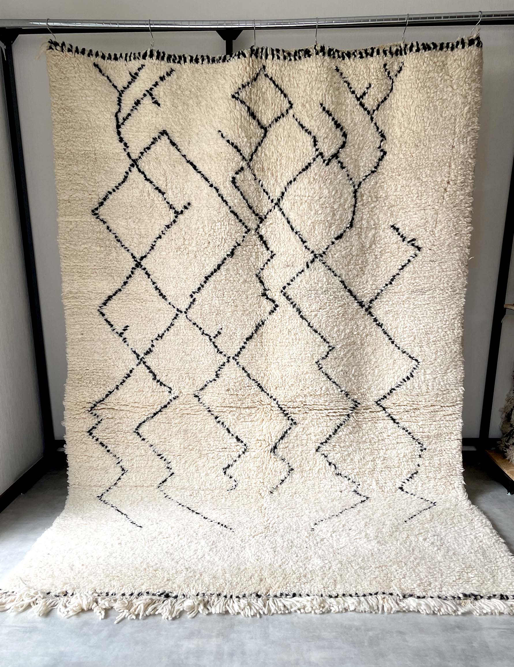 ベニワレンはモロッコのアトラス山脈に住むベルベル人女性によって、一目一目しっかりと結びながら織らているハンドメイドのウールラグです。白を基調とし黒の細いラインで模様が描かれています。触り心地はふわふわと柔らかく長い毛足が特徴です。白を基調としたシンプルなデザインとナチュラルな色合いは、コーディネートの幅も広く他のインテリアとも調和しやすいです。