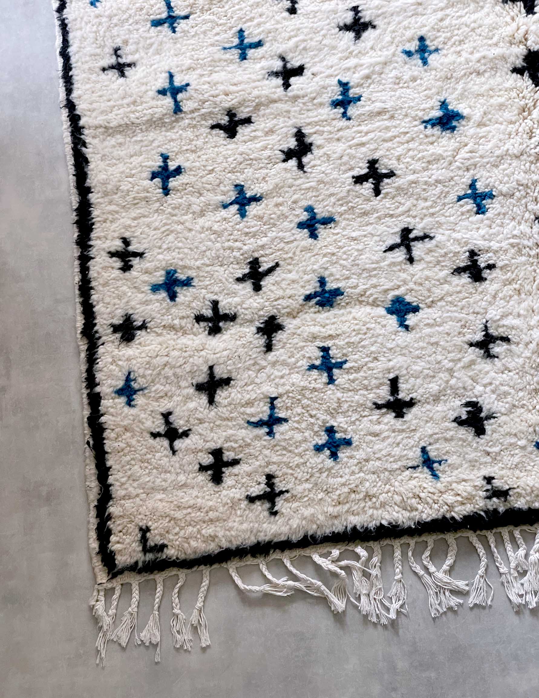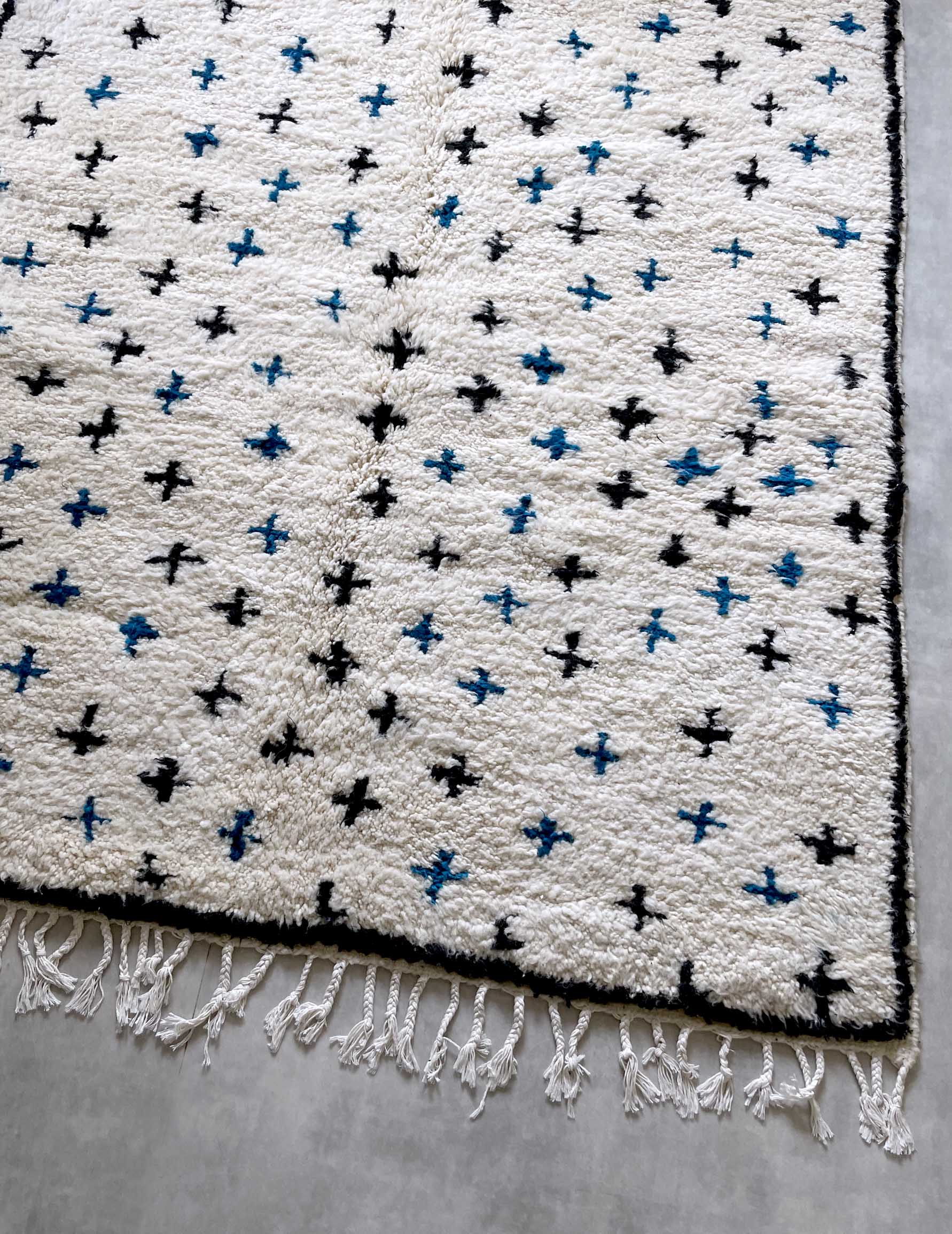 モロッコのアトラス山脈に住むベルベル人女性によって、一目一目しっかりと結びながら織らているハンドメイドのウールラグです。Zarabiyaのオリジナルデザインで、触り心地はふわふわと柔らかいです。シンプルなデザインとナチュラルな色合いは、コーディネートの幅も広く他のインテリアとも調和しやすいです。