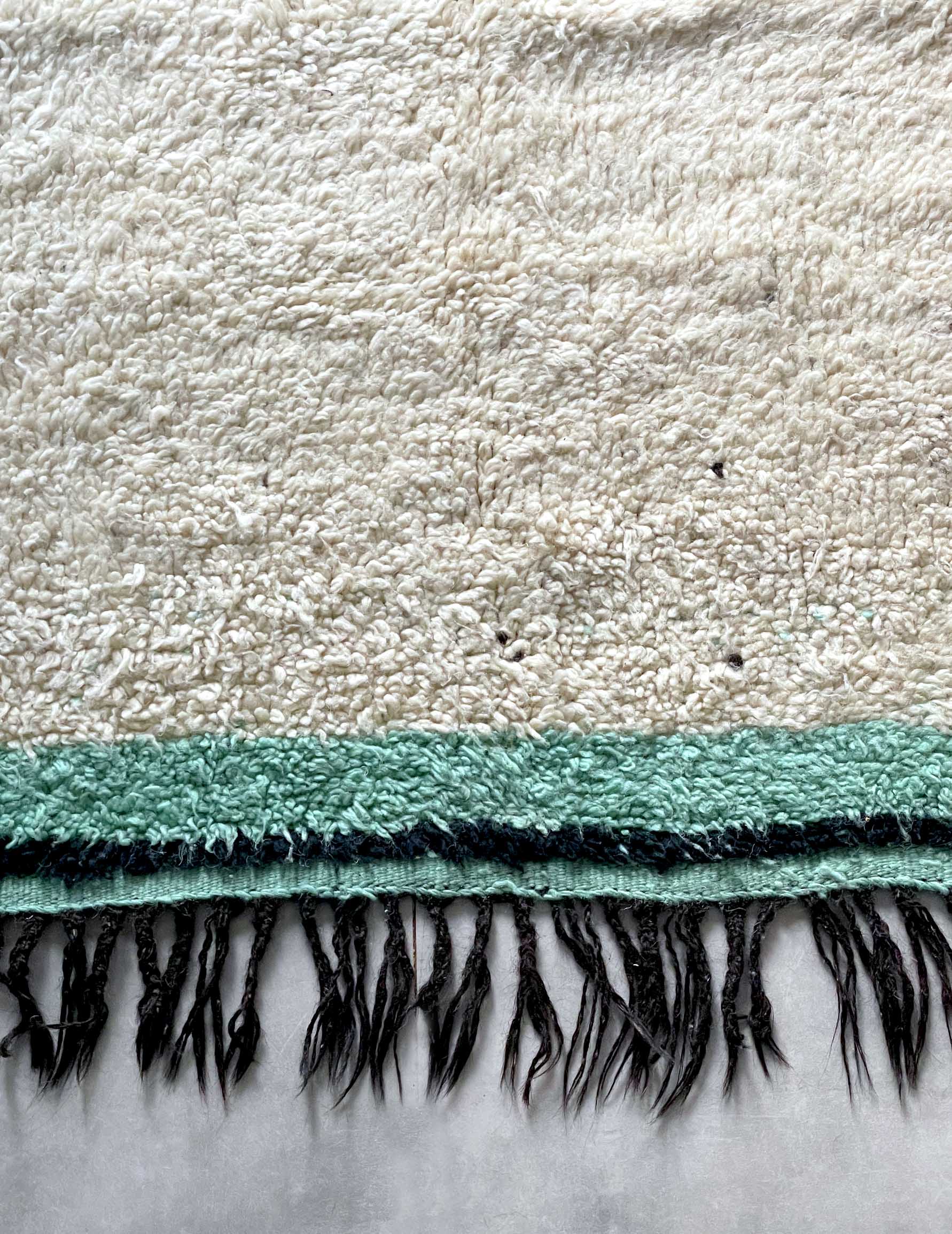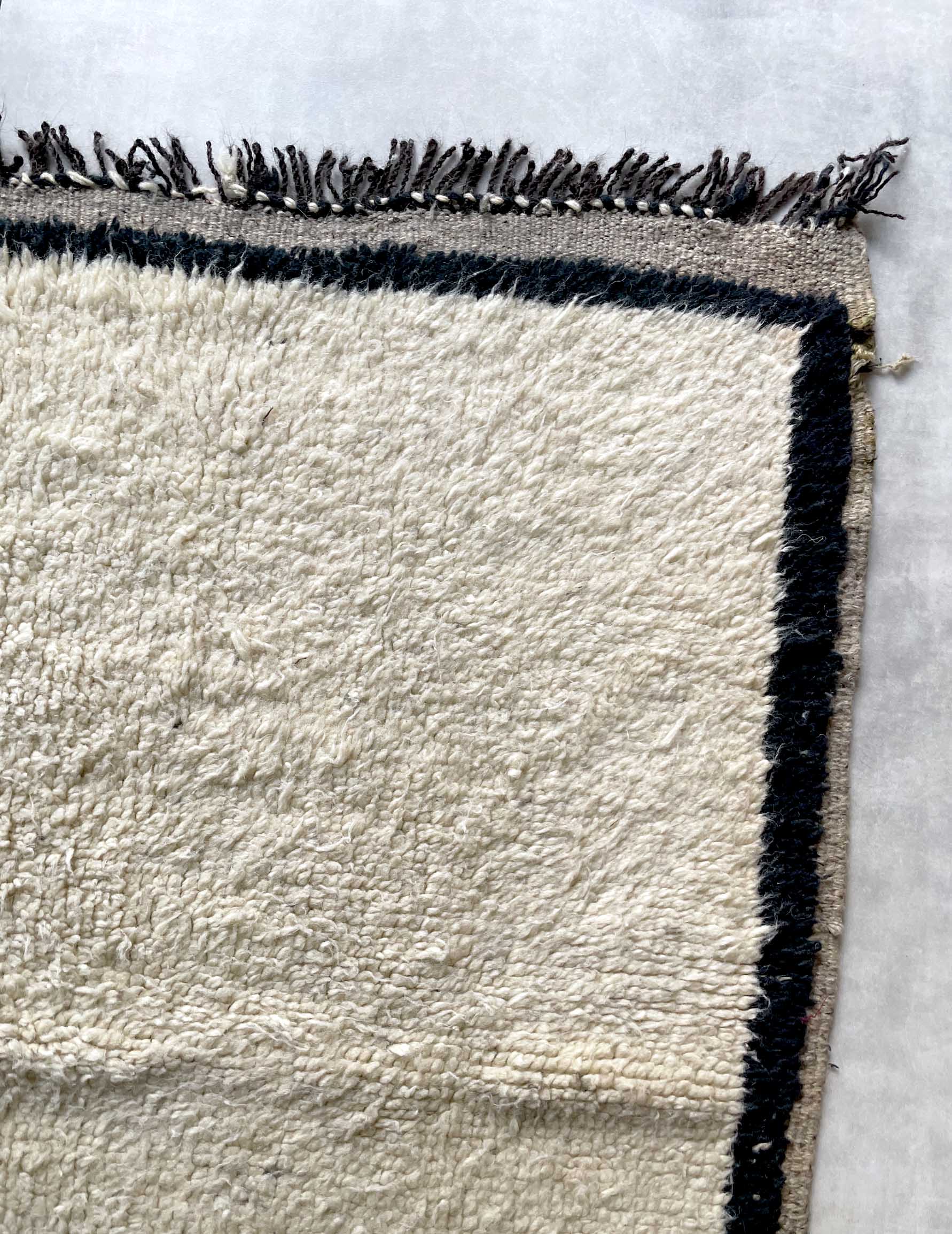 モロッコのアトラス山脈に住むベルベル人女性によって、一目一目しっかりと結びながら織らているハンドメイドのウールラグです。Zarabiyaのオリジナルデザインで、触り心地はふわふわと柔らかいです。シンプルなデザインとナチュラルな色合いは、コーディネートの幅も広く他のインテリアとも調和しやすいです。