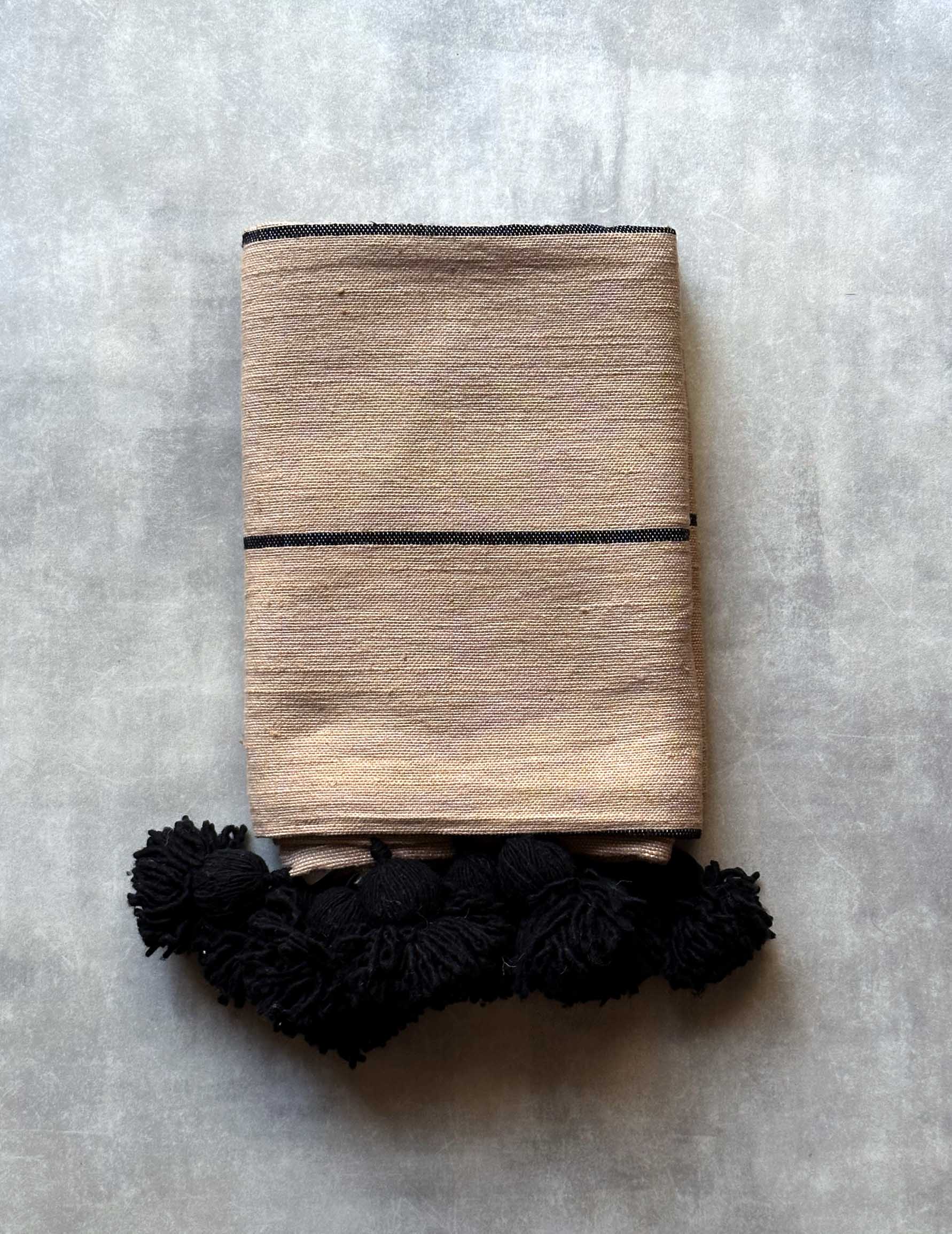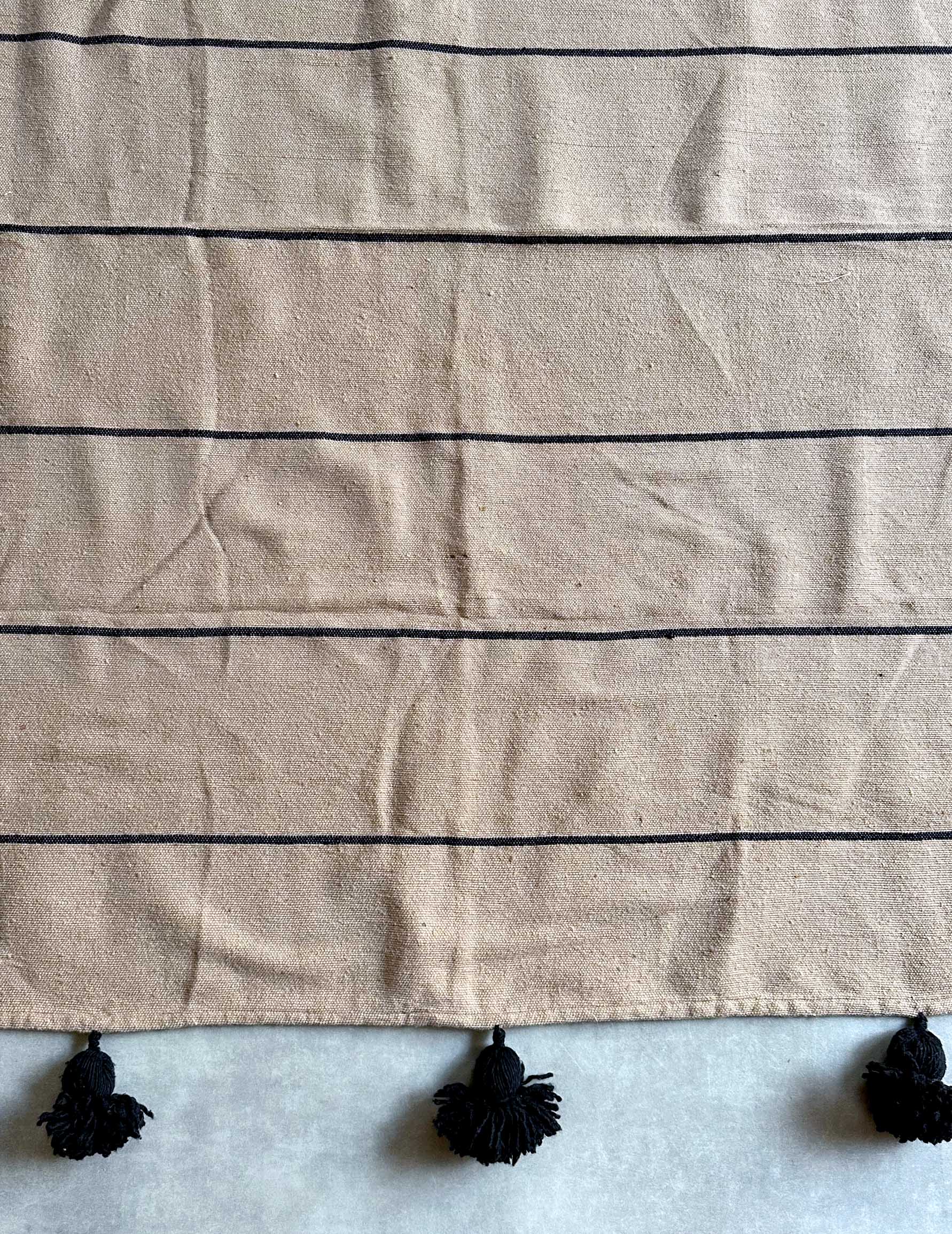 手織りで1枚1枚丁寧に織られた綿100%のブランケット。厚地でしっかりとした生地で、両端にポンポンがついています。