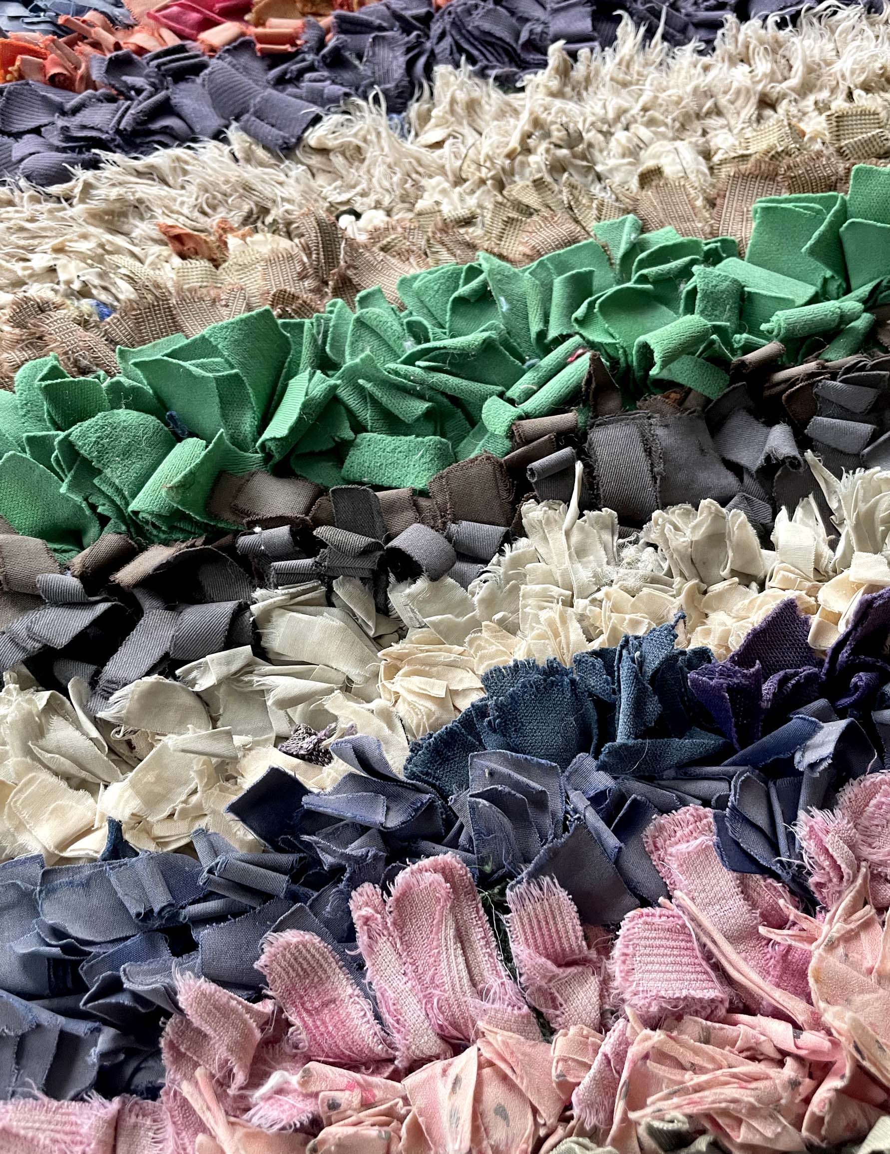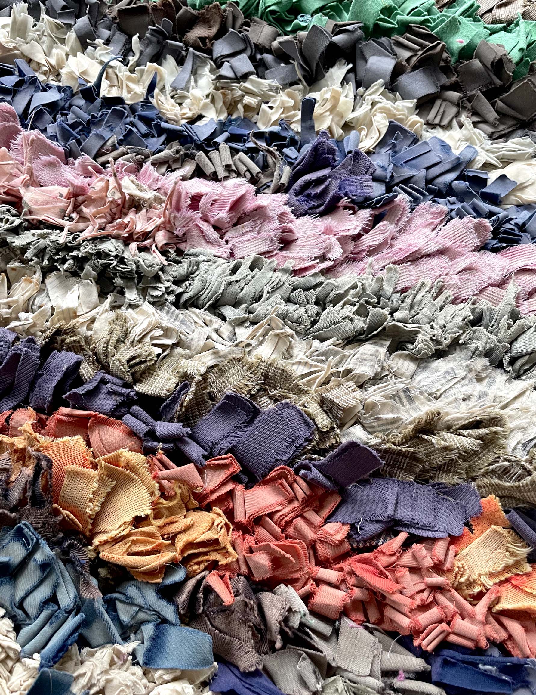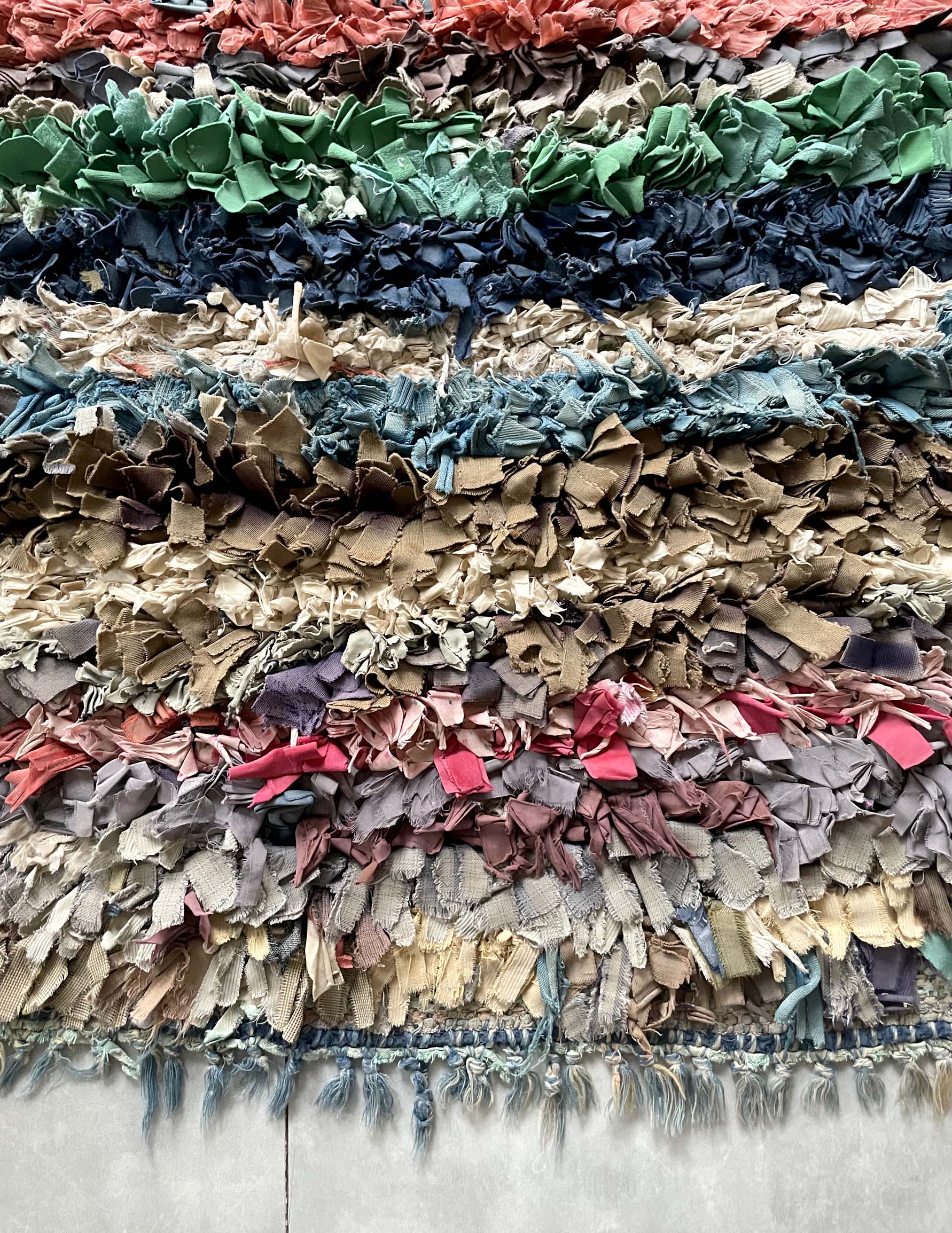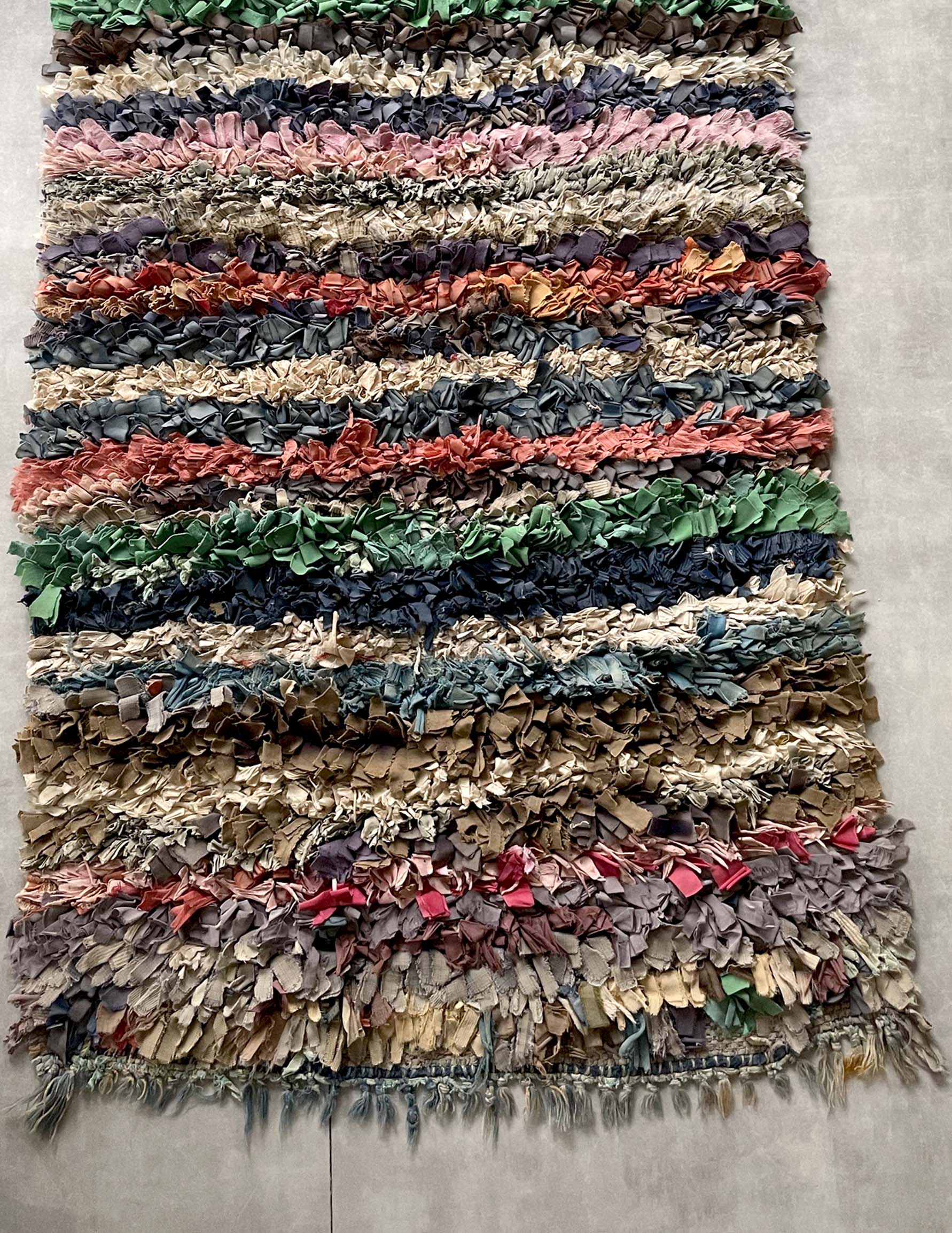 ボシャルウィットはアトラス山脈に住むベルベル人の女性が衣類などの生地を裂いて編み込んだリサイクルモロッカンラグです。全て異なった生地を使用している為、色味の配色や長短が様々で全て1点物となります。またモロッコではラグとして使用されるだけではなく、壁に飾りアートとしても生活に取り入れられています。