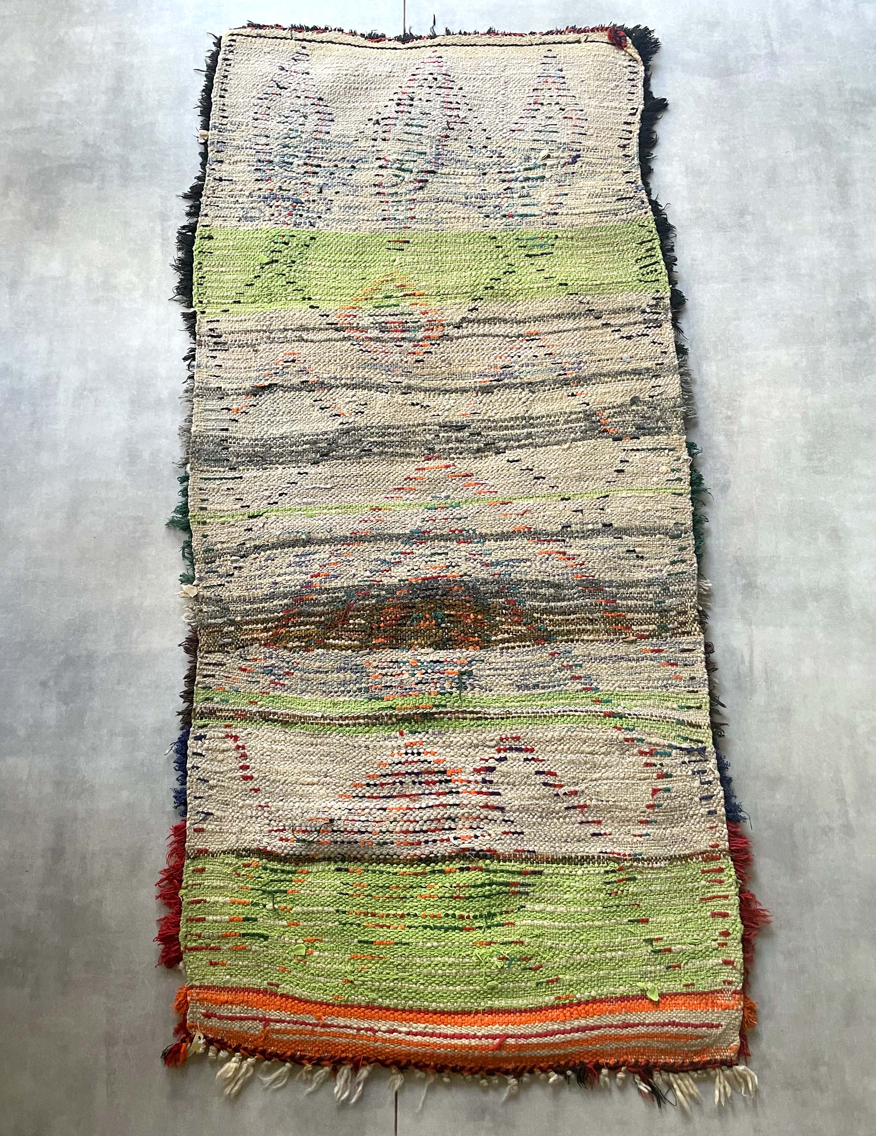 全てベルベル人女性により織られたハンドメイドのラグで、同じ物は1つとしてありません。織り目が詰まっていないため季節を問わずご使用いただけます。