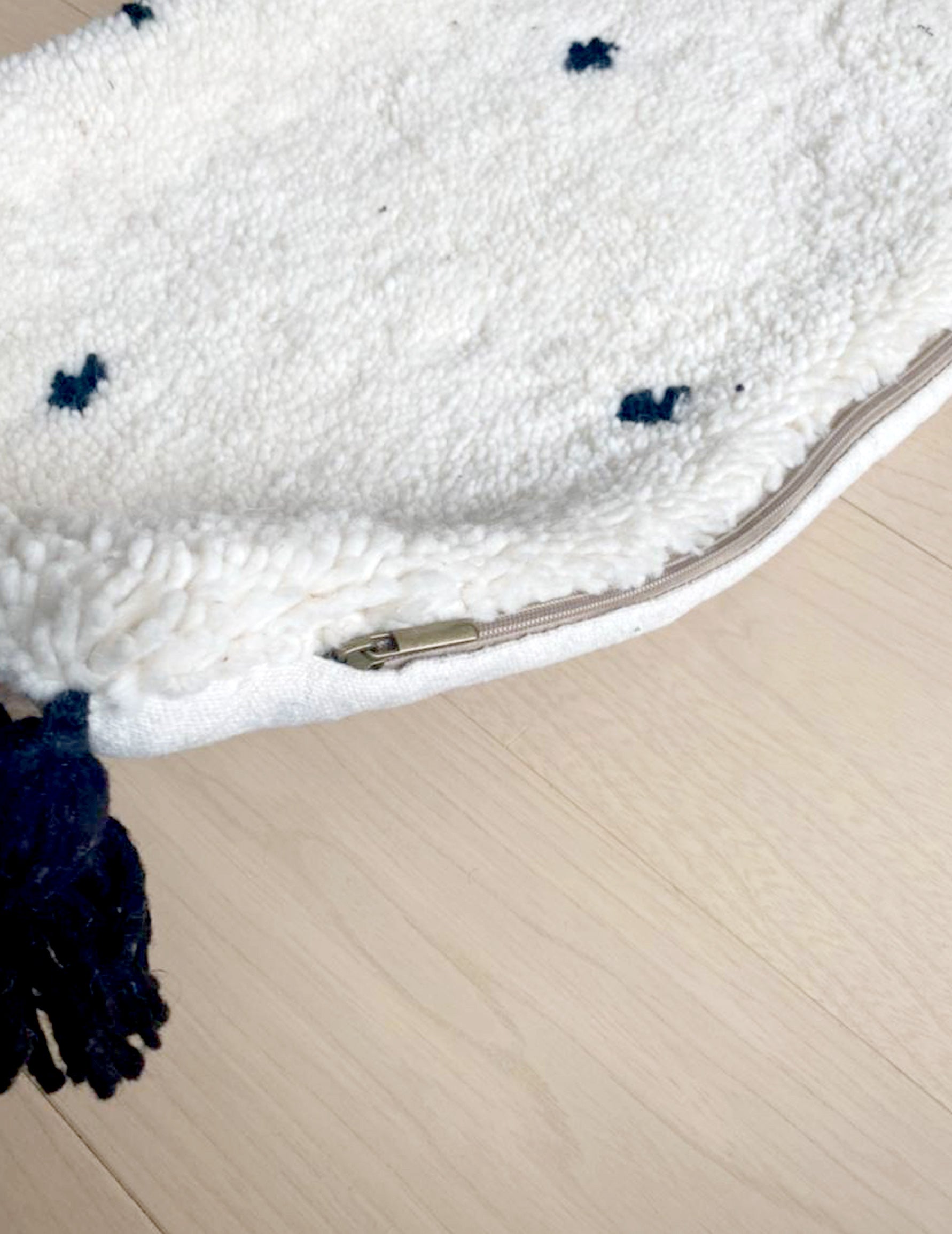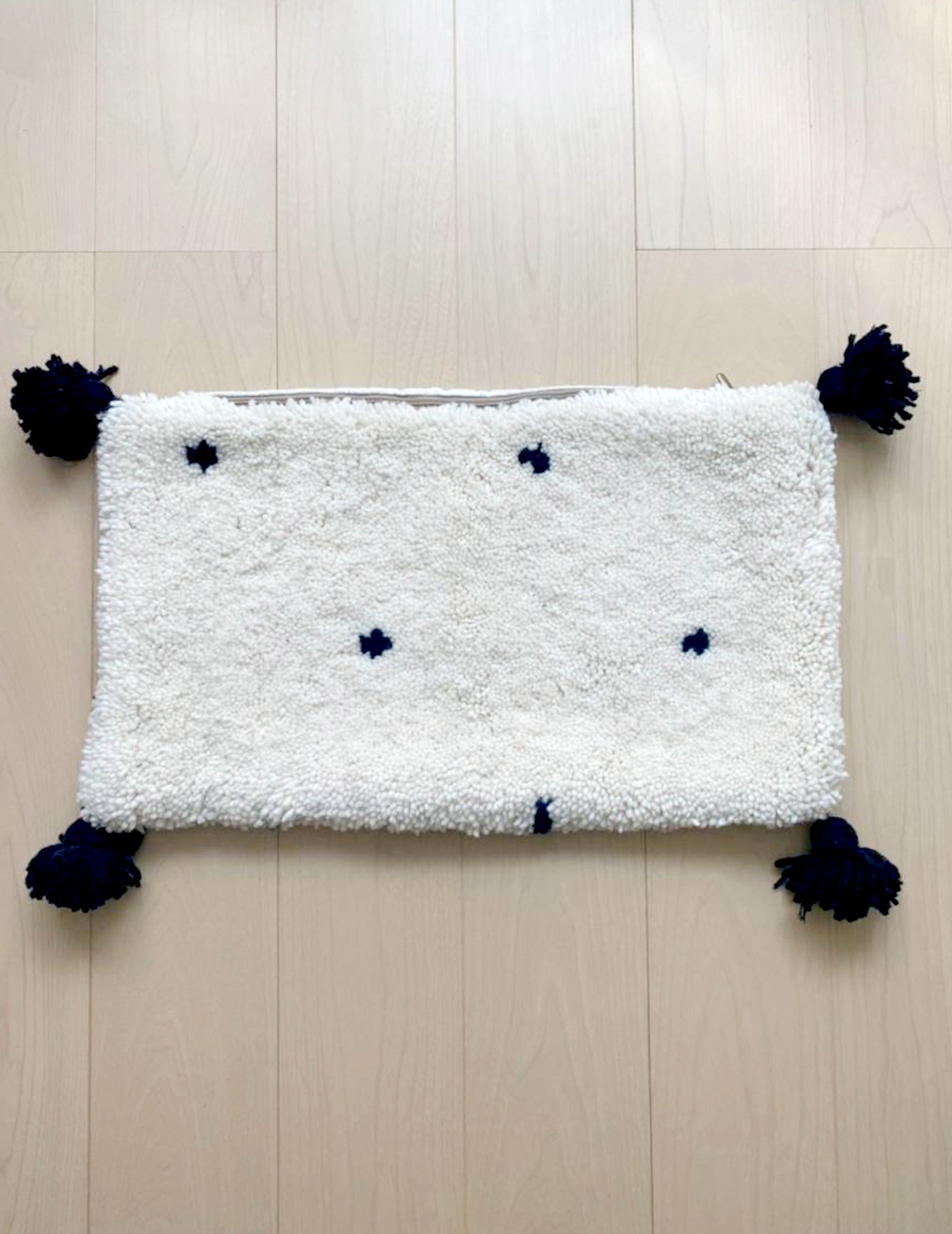 ベニワレンはモロッコのアトラス山脈に住むベルベル人女性によって、一目一目しっかりと結びながら織らているハンドメイドのウールラグです。白を基調とし黒の細いラインで模様が描かれています。触り心地はふわふわと柔らかく長い毛足が特徴です。