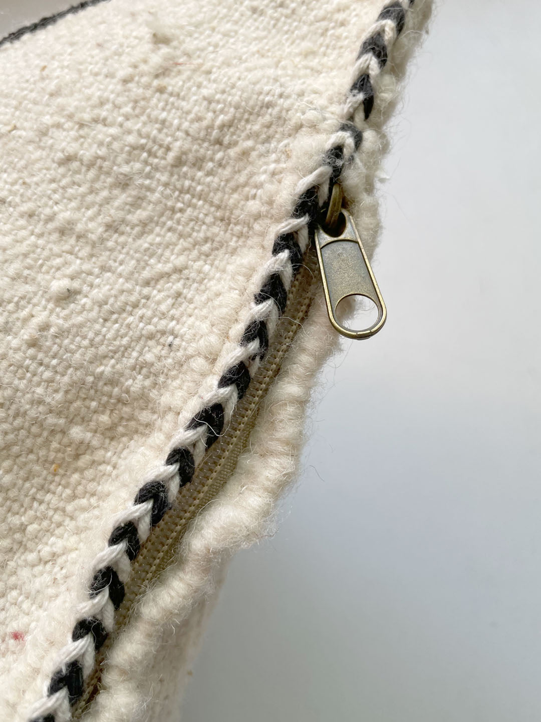 ベニワレンはモロッコのアトラス山脈に住むベルベル人女性によって、一目一目しっかりと結びながら織らているハンドメイドのウールラグです。白を基調とし黒の細いラインで模様が描かれています。触り心地はふわふわと柔らかく長い毛足が特徴です。