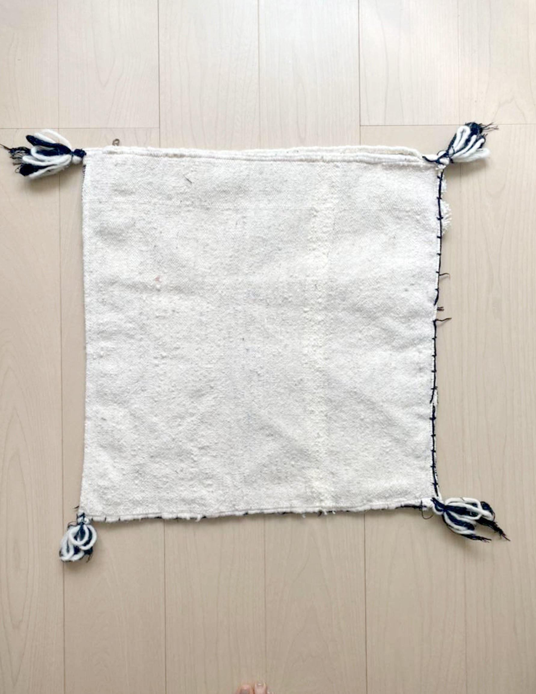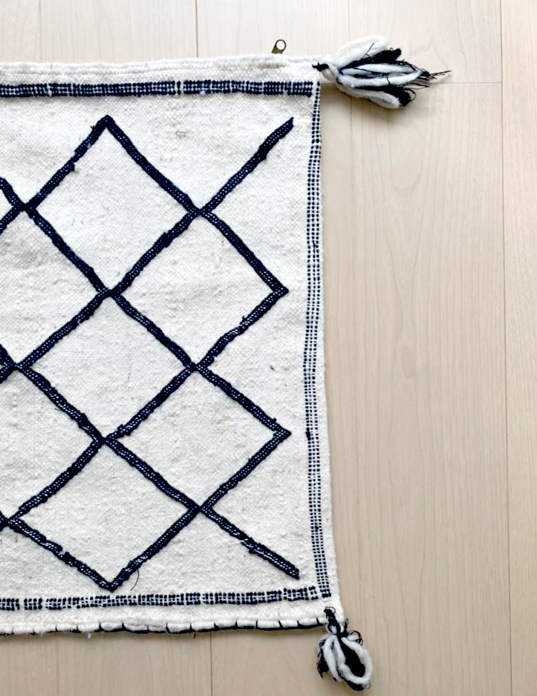 ベニワレンはモロッコのアトラス山脈に住むベルベル人女性によって、一目一目しっかりと結びながら織らているハンドメイドのウールラグです。白を基調とし黒の細いラインで模様が描かれています。触り心地はふわふわと柔らかく長い毛足が特徴です。