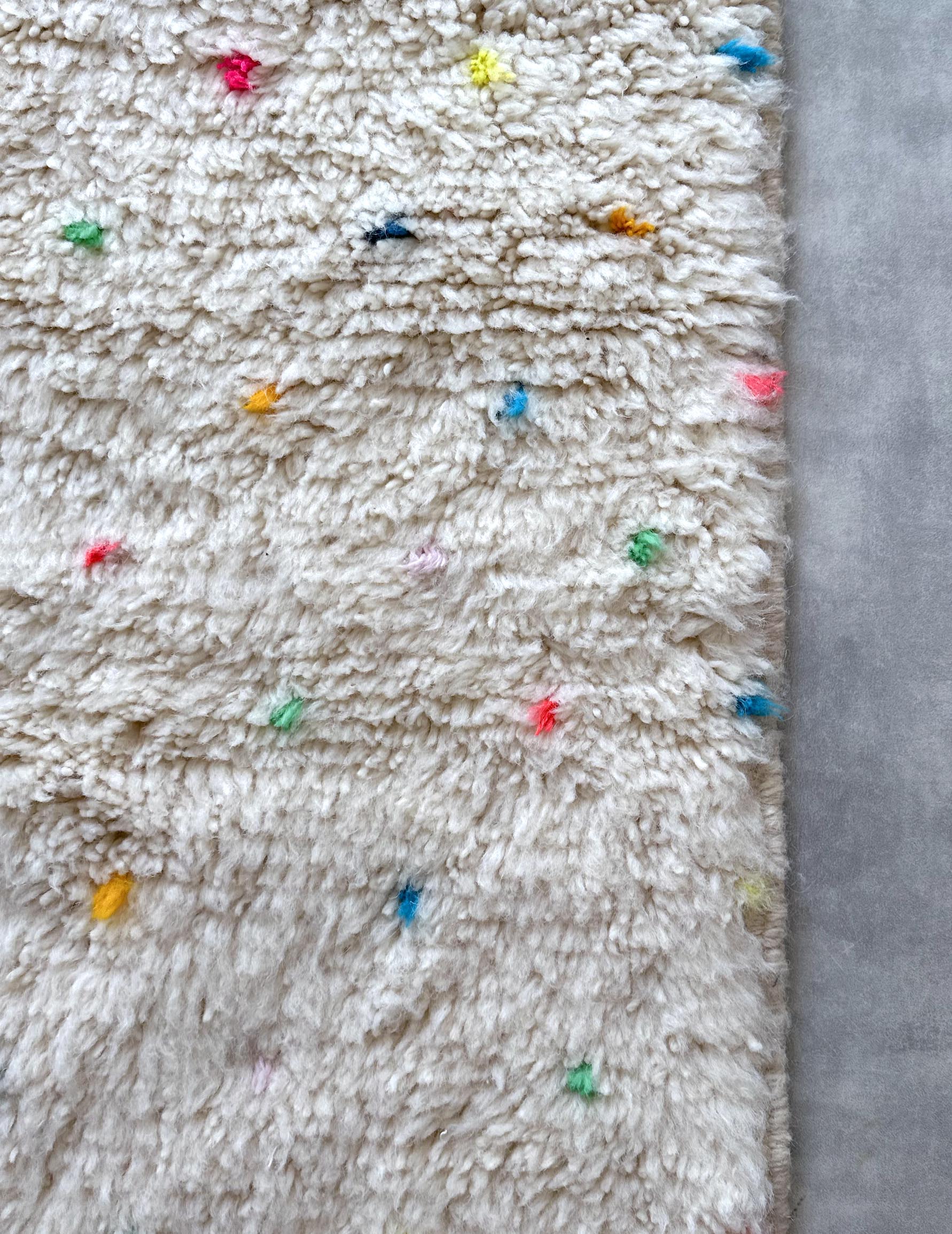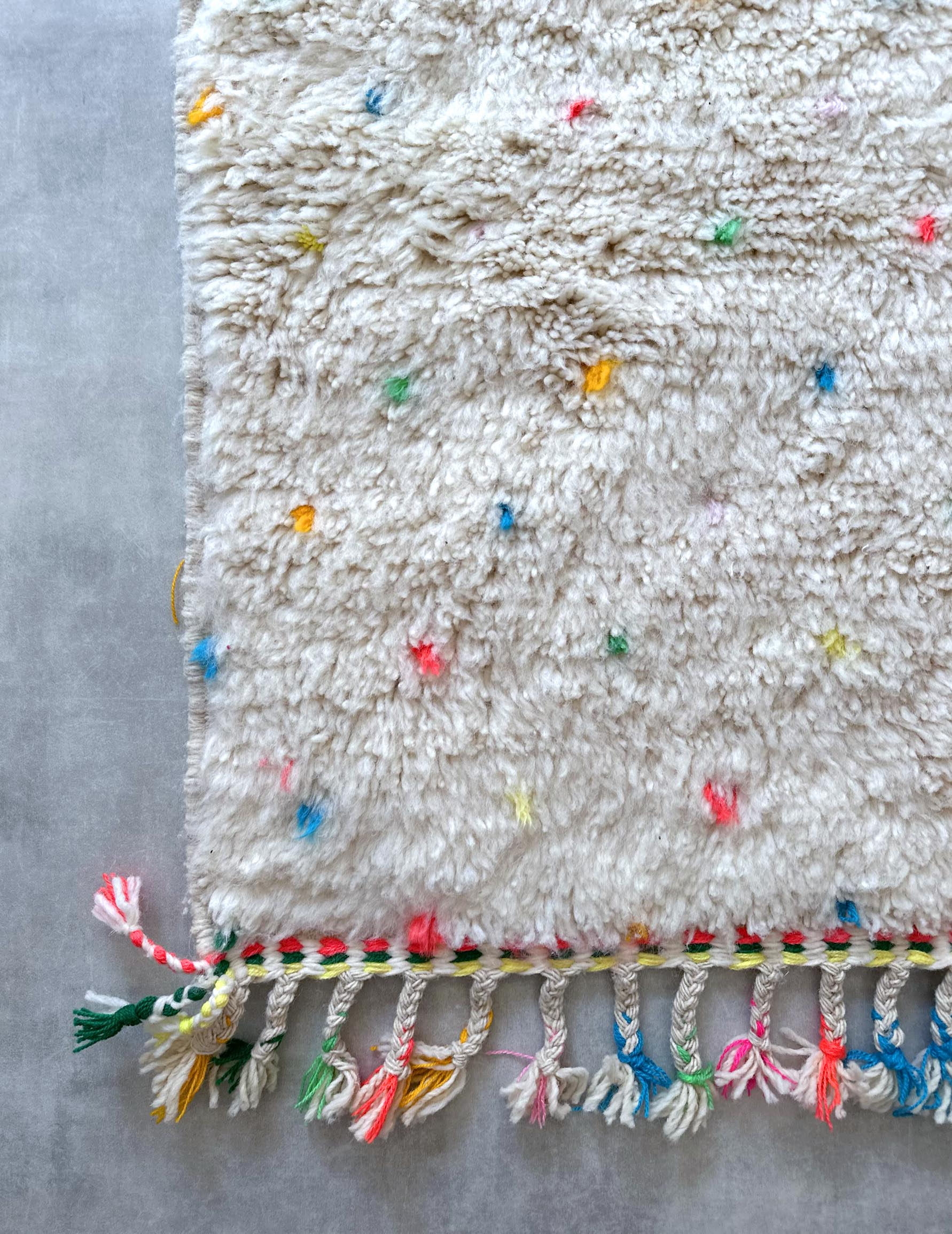 モロッコ・アトラス山脈に古くから住むベルベル人女性が、伝統的な手法を受け継ぎながら上質なウールで一枚ずつ丁寧に手織りしたラグです。カラフルなドット模様と鮮やかなサイドフリンジが、どの空間もぱっと明るく楽しい雰囲気に変えてくれます。