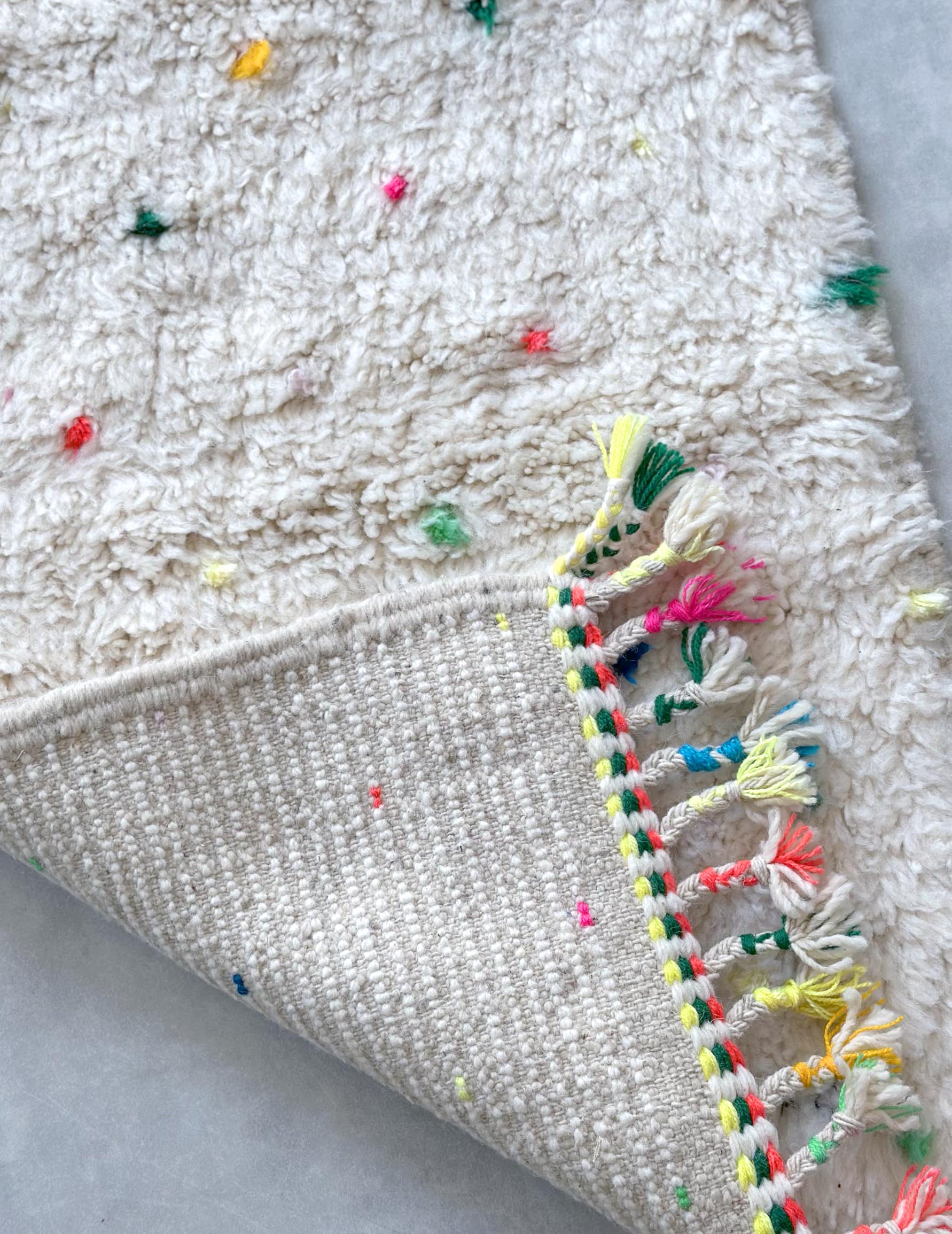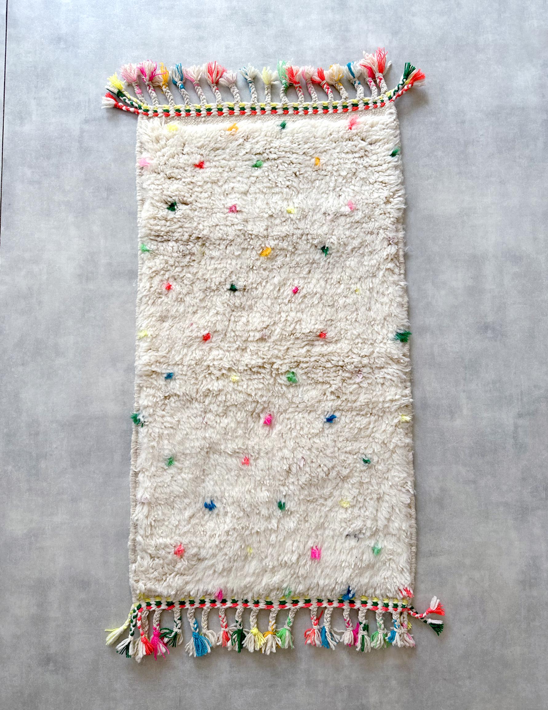 モロッコ・アトラス山脈に古くから住むベルベル人女性が、伝統的な手法を受け継ぎながら上質なウールで一枚ずつ丁寧に手織りしたラグです。カラフルなドット模様と鮮やかなサイドフリンジが、どの空間もぱっと明るく楽しい雰囲気に変えてくれます。
