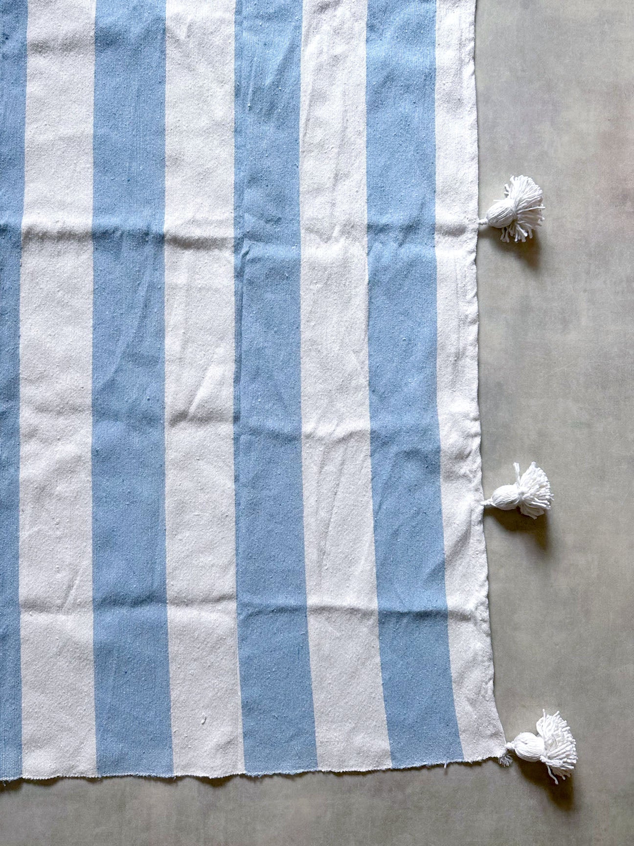手織りで1枚1枚丁寧に織られた綿100%のブランケット。厚地でしっかりとした生地で、両端にポンポンがついています。