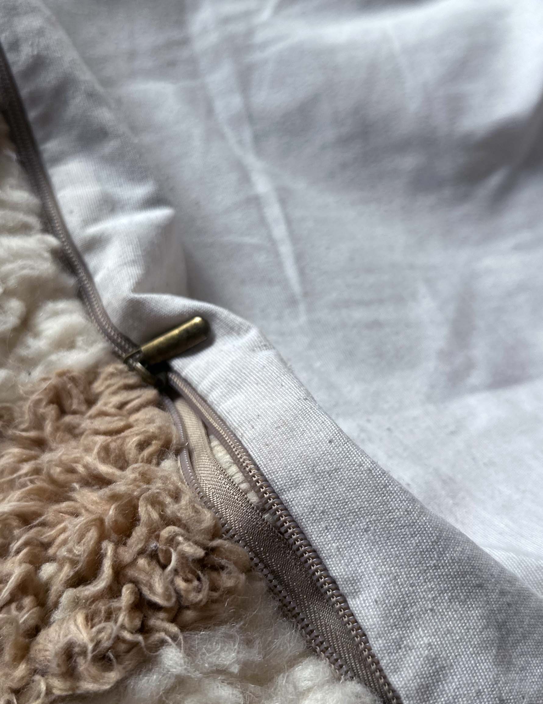 チェッカープーフは、モロッコのアトラス山脈に住むベルベル人女性によって、一目一目丁寧に結びながら織られたハンドメイドのウールラグです。白とブラウンのチェッカーパターンを基調に、長い毛足が特徴です。このラグを使用して作られたプフです。
