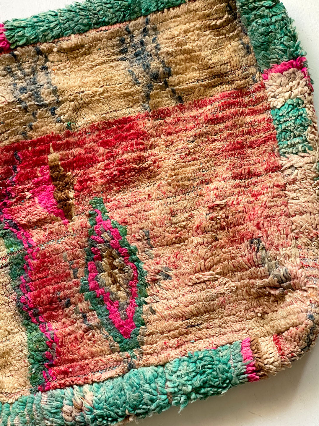 ブジャドプフはモロッコのアトラス山脈に住む、ベルベル人女性によって編まれた毛の短いウールラグを使用し作られたプフとなります。