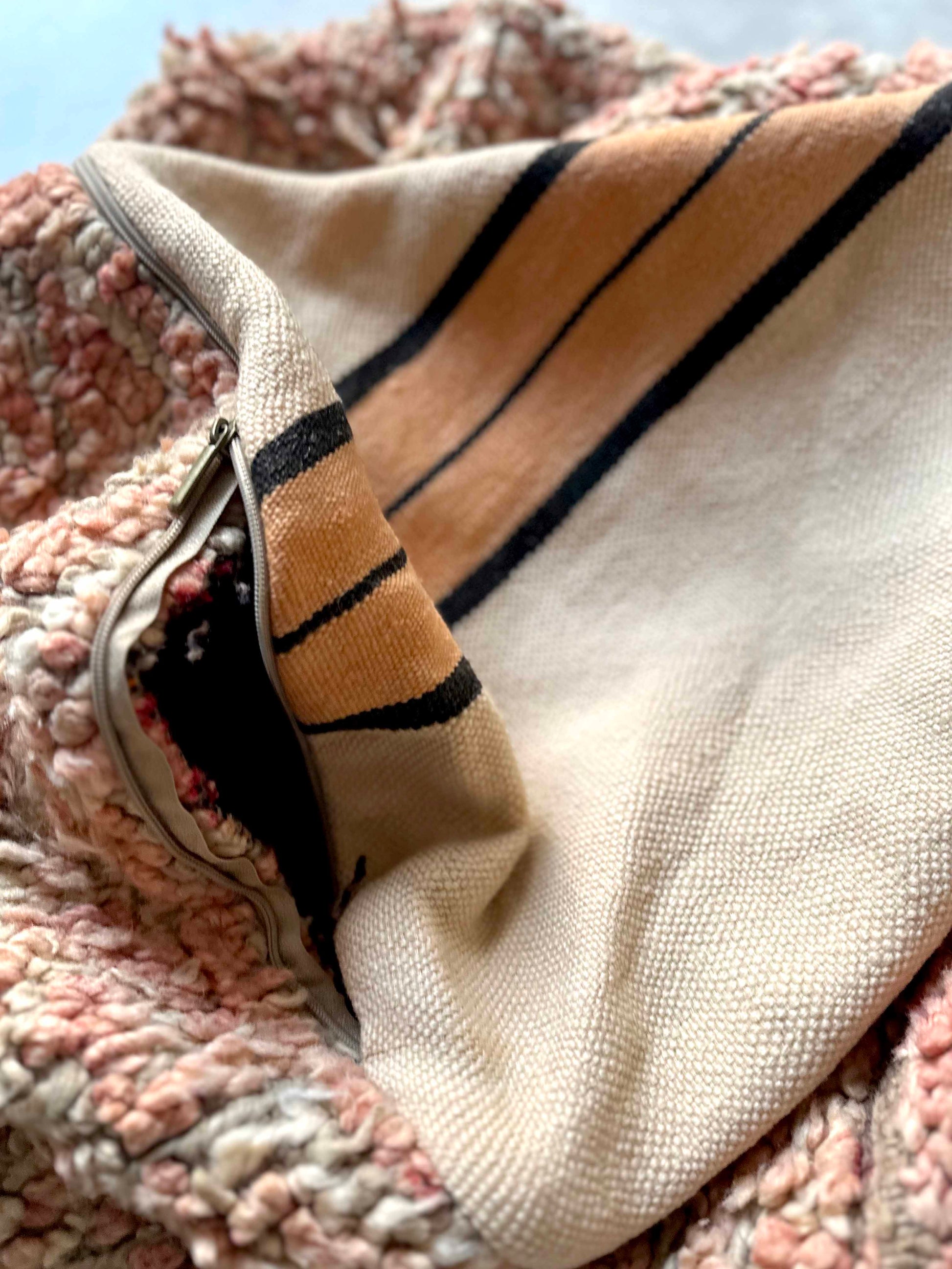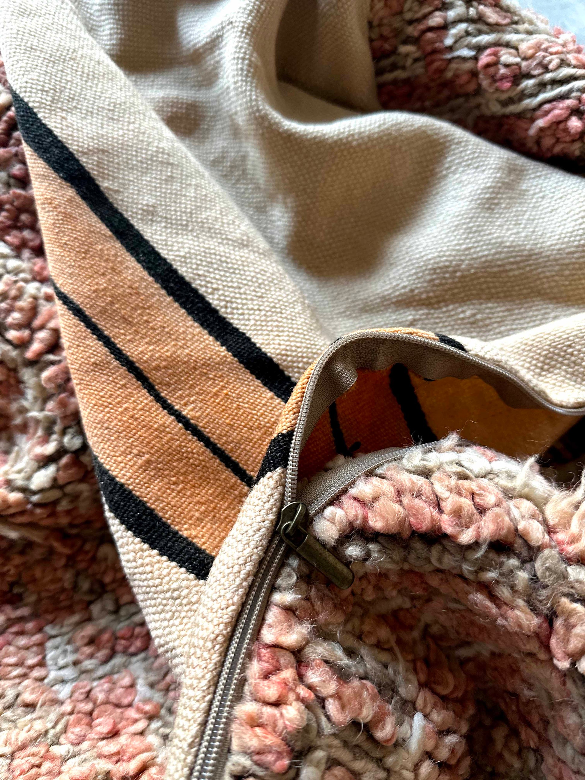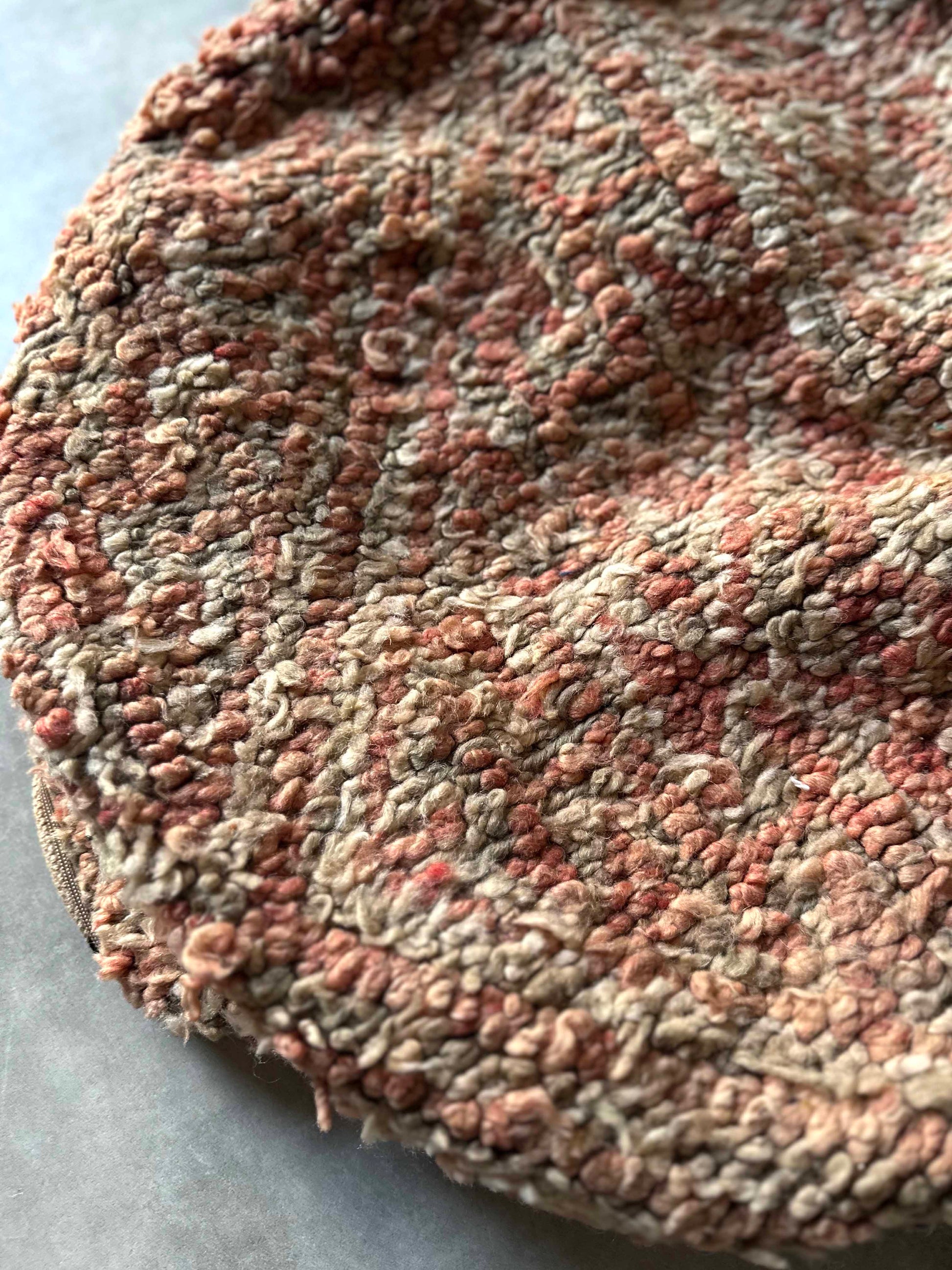 ブジャドプフはモロッコのアトラス山脈に住む、ベルベル人女性によって編まれた毛の短いウールラグを使用し作られたプフとなります。