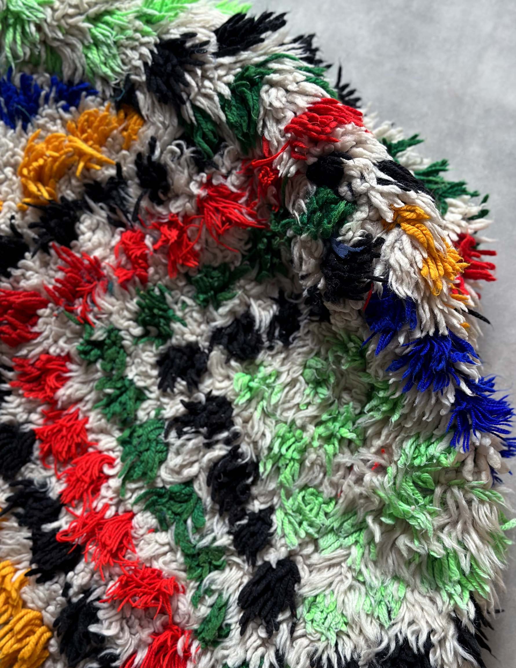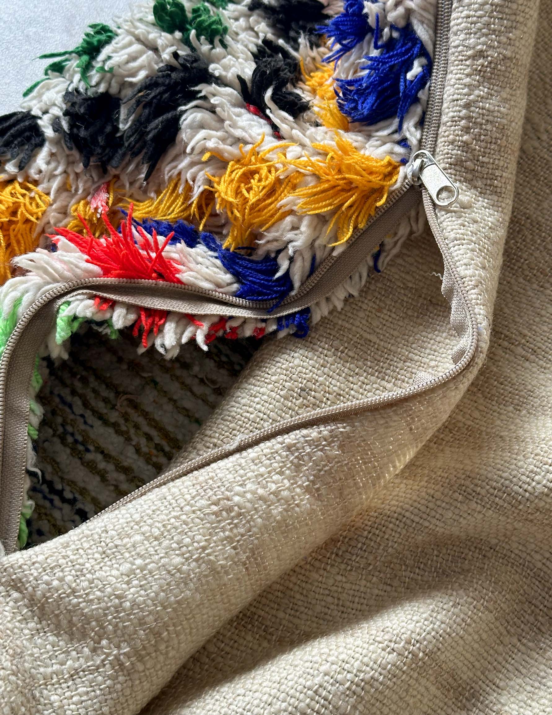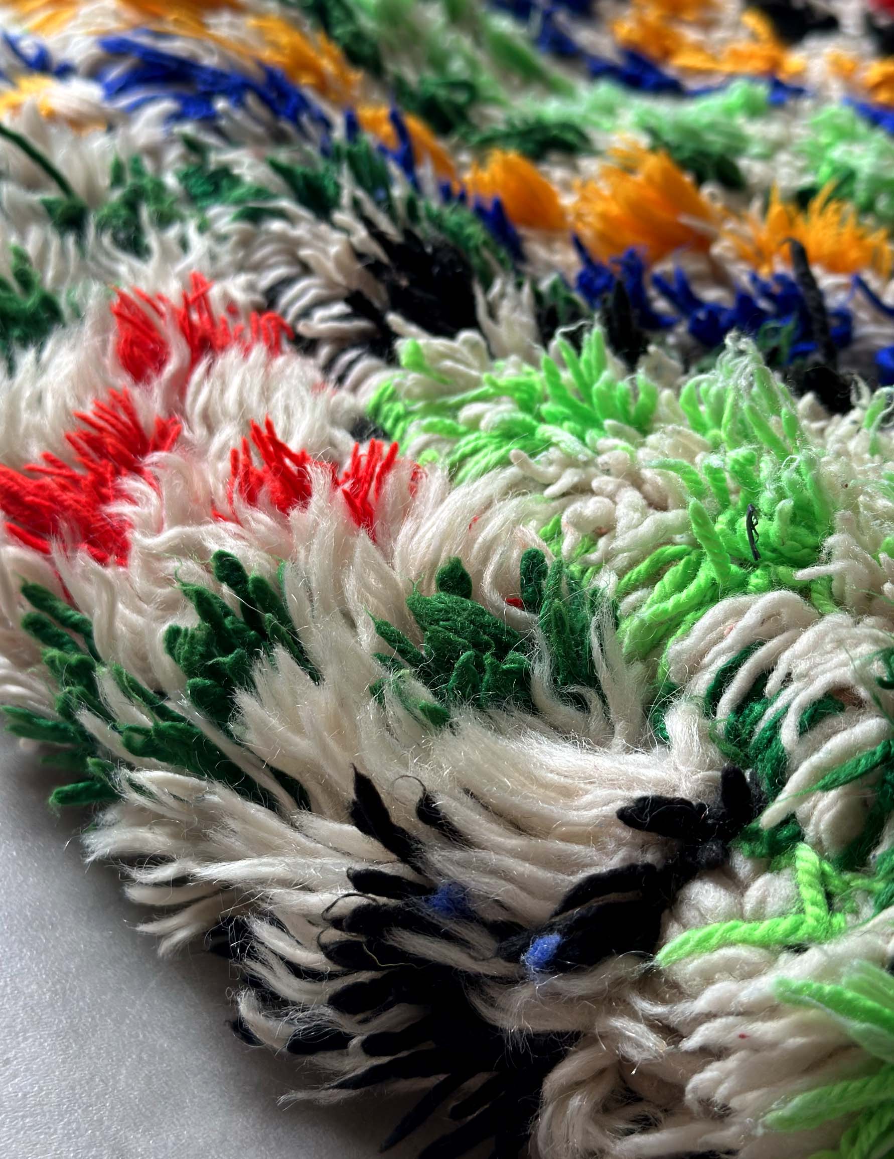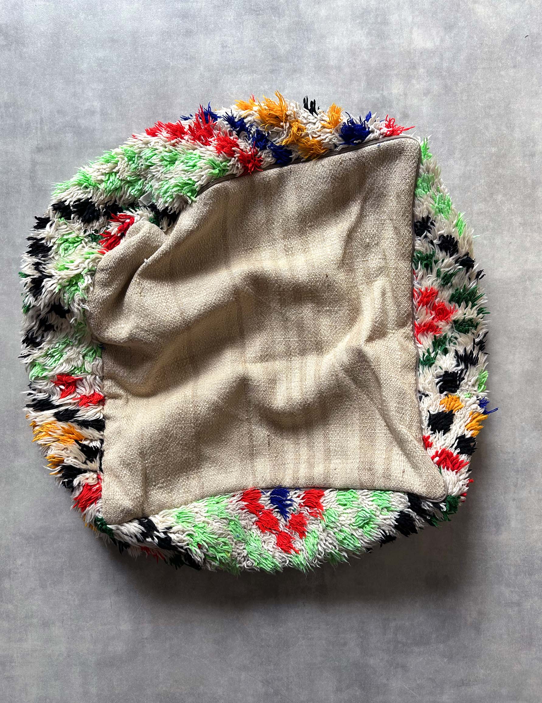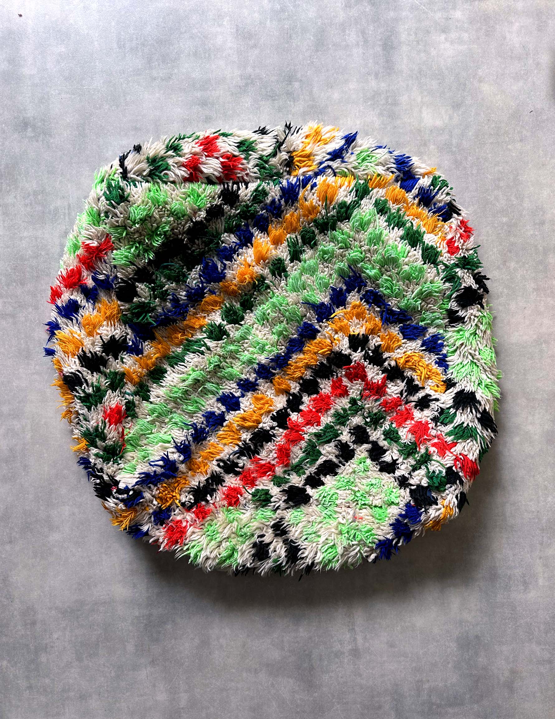 ブジャドプフは、モロッコのアトラス山脈に住むベルベル人女性によって編まれた、毛足の短いウールラグを使用して作られたプフです。
